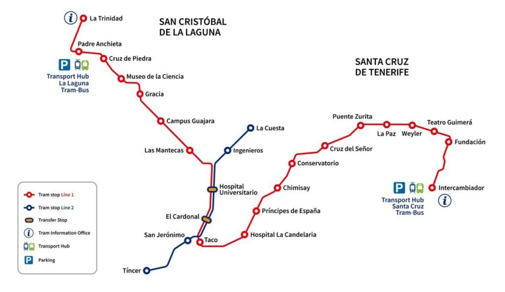 - Linie 1: Die Hauptlinie, die Santa Cruz mit La Laguna verbindet. Sie ist ideal, um die historische Altstadt von La Laguna (UNESCO-Weltkulturerbe) zu besuchen. Die Trams fahren tagsüber sehr häufig, oft alle 5 bis 10 Minuten.