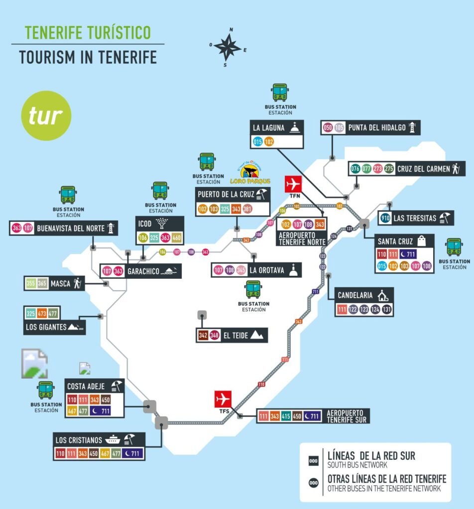 - Anbindung der Flughäfen: Spezielle Linien verbinden sowohl den Flughafen Teneriffa Süd (TFS) als auch den Flughafen Teneriffa Nord (TFN) mit den Hauptorten.